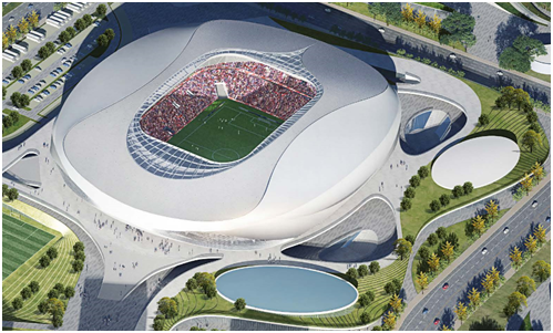 亞洲杯足球比賽場地建設(shè)項目總建筑面積約19.4萬平方米,其中鋼結(jié)構(gòu)主要包括1座5萬座專業(yè)足球場及配套全民健身館,配套全民健身館包含1座多功能館,1座游泳訓(xùn)練館。