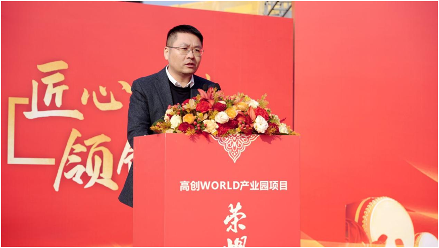 錢塘新區(qū)建設(shè)投資集團有限公司副總經(jīng)理徐建宣布高創(chuàng)WORLD產(chǎn)業(yè)園項目主體正式結(jié)頂